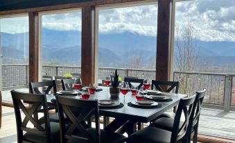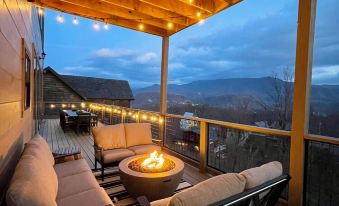 DECKS/DECKS/VIEWS/VIEWS !! Large, expansive, and covered! Relax and enjoy the hot tub after a long day of hiking and gaze at the twinkling stars and cabin lights that dot the valley below. You will find a nice dining area with fire table and plenty of comfortable outdoor seating for all to enjoy the mountain air and sounds of the outdoors. Don't forget the fire pit area! Nothing is more relaxing than sitting down and enjoying the fire with a glass of wine....Wait, perhaps enjoying a glass of wine in the hot tub!!