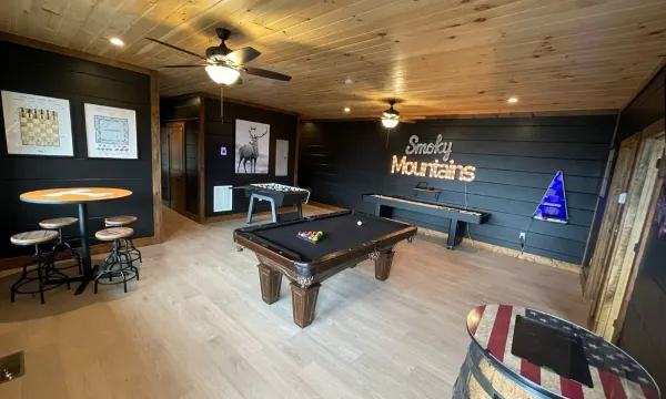 The lower level is just as wonderful as the main level. A huge game room with a pool table, shuffle board, multicade/video game machine with over 60 games on it, foosball, large flat screen TV, pub table, and multiple board games will surely keep everyone entertained and make a lifetime of memories! If that is not enough for you, we have a Pinball machine and another multicade video game in the loft bedroom!! Did I mention the VIEWS! Beautiful....Stunning! There are 2 more beautiful master bedrooms with en-suites, both with access to the massive decks on the lower level. There is access to the decks from EVERYWHERE in this cabin to allow you to enjoy the beauty that is the Smoky Mountains.