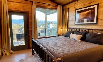 Our cabin has 5 bedrooms--4 master bedrooms with its own attached bathrooms and a large loft bedroom that all the kids and adults are sure to enjoy! There is no shortage of hang out spots and places to relax. As you enter the cabin on the main floor, you will be greeted with large, grand windows that showcase the stunning mountain views, vaulted ceilings, and an amazing floor to ceiling stone fireplace. A large dining area and generous kitchen with great views of the mountains is there for all to enjoy. The chef of the family will enjoy top of the line appliances, granite counter tops, and a fully stocked kitchen to make a gourmet meal. For those who love to grill, a charcoal grill is available. A spacious and beautiful master bedroom with en-suite that has access to the huge deck completes the main floor.