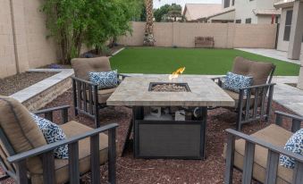 Your perfect home away from home. This home features soaring vaulted ceilings, and the absolute best of everything. Grand entrance with both formal living area and dining room. Crown molding in entryway and oversized baseboards throughout. Professional kitchen has 6 foot refrigerator and freezer, everything you would expect in a professional kitchen is accounted for. GE Monogram 36" pro style range with built in grill, Microwave drawer with a separate warming drawer underneath. Pot filler for filling large pots right at range. Two separate dishwashers and double drawer mini fridge built right into island. To stay hydrated on your visit, this home has an easy access built in water chiller and RO system. The kitchen is open to Family Room, which is equipped with 7.2 surround sound (7 speakers and 2 subwoofers) for that ultimate theater experience and capped off with a 90 inch big screen TV. The Family room also features lush seating and a cozy fireplace for quiet evenings. The patio features a commercial light switch operated misting system and patio fan. The backyard is stunning with multiple seating areas, including a fire pit. There is a full BBQ area located under pergola with string lights, where you can cook up steaks on 6 burner grill or cook in the outdoor oven. Living room features 55 inch 4k TV, Netflix, YouTube tv, paramount + and Amazon prime are available throughout. The master bedroom is grand and fit for royalty, with its 75 inch 4k smart tv and fancy king bed. Master bathroom features large soaker tub and double bowl granite sinks. Master closet is the size of bedroom with its 14 foot ceiling......Come see all that Gilbert has to offer in this wonderful home.About pets:No pets allowed.About checkOut:Check out before 11:00 AM.About children:Children allowed: ages 0-17.Tell us if you need anything for children..About customRules:ABSOLUTELY NO PARTIES/EVENTS/GATHERING. You will be removed. No smoking/vaping/marijuana (including backyard). Quiet time after 10pm. No shoes..New travelers with fewer than three reviews, must send us personal message before booking :),Please review rules with all guests traveling with you. Park in garage and driveway(6 spaces available). HOA strongly discourages parking in street..About checkIn:Check in after 4:00 PM.About smoking:Smoking is not permitted.About minBookingAge:Minimum age to rent: 18.About events:No events allowed.