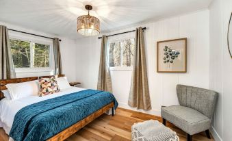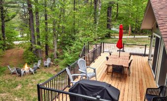 Hidden Creek Cottage is a bright oasis within the New Hampshire lakes region. The floor-to-ceiling windows in the living area fill the space with natural light. The kitchen has been newly renovated with white quartz countertops, white cabinets, and stainless steel appliances perfect for your culinary needs. The primary bedroom boasts a king bed with a memory foam mattress and an ensuite half bath. All bedrooms are equipped with room-darkening curtains to ensure your sleep is as peaceful as your surroundings. Curl up next to the fireplace in the living room with your loved ones, dine al fresco on the newly built deck, gather around the fire pit for endless conversation, and enjoy the peaceful view of the creek within the woods surrounding the home. The washer and dryer are located in the full bathroom and available for your use throughout your stay.