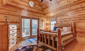 • Bedroom 2 (Main Floor): Queen log bed, dresser, French doors to deck
