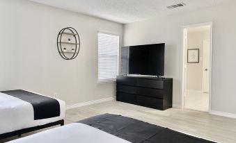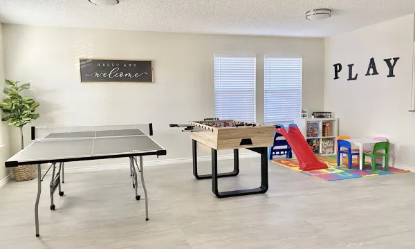 Modern yet cozy and inviting! Fully renovated, open concept home with plenty of space for large family gatherings. There are two 65in smart TVs throughout the home with plenty of amenities to keep your family entertained! Foosball table, ping pong, backyard pool, board games, and a kids' play area.