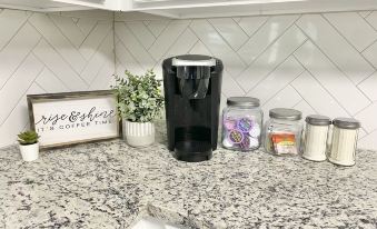 Fully equipped kitchen with modern appliances, sleek wood cabinetry and ample overhead lighting. Not to mention, a toaster and Keurig for your morning coffee and tea.