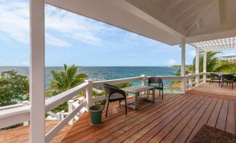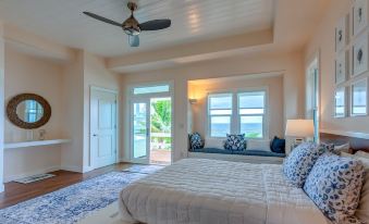 Two bedrooms with en-suite baths flank the open plan living area, kitchen, and dining area, and each room has large windows and doors that open onto the porch and the Sea of Abaco views. The third bedroom and bath is accessed separately below the main entry, offering an additional level of privacy for those guests. This bedroom location is a little funky. It is accessed underneath the main house stairs. It is completely separate.