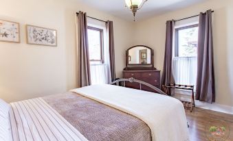 Two cozy bedrooms await you—one with a queen bed and the other with a full bed. Each room is thoughtfully equipped with bedside lamps, phone chargers, dressers, blackout curtains, and luggage racks for your comfort.