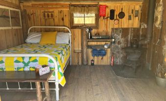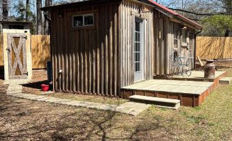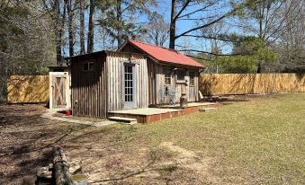 Experience a true off grid cabin, (no electricity) with full size bed, wood stove, camp stove, with coffee, and tea pots, table and chairs, solar lights, and lanterns. Relax, sitting on the porch, while enjoying the peaceful view of the pond. Also has a bathroom with composting toilet, and rain barrel water system, with sink. Separate off grid style shower room, with supplies. You have the option to have the (friendly) goats stay with you, in the cabin yard, or just visit them in the separate goat area. Stocked pond for fishing. Fire pit outside your door. Walking trails, and chickens also on the property. Gather your fresh eggs for breakfast, if desired. Property is completely fenced, and you will have a gate code to enter and exit. You will also have your own, covered parking space. Maximum stay is three nights. Dollar store, and gas station across the street for ice, or anything you might need. Only three miles to Wal-Mart, and other shopping. Close to everything, but with the feel of privacy, and seclusion. Also, if you are interested in gem mining, Diamond Hill Mine in Abbeville is near by.About pets:No pets allowed.About checkOut:Check out before 11:00 AM.About children:Children allowed: ages 0-17.Keep in mind, there is only a full size, and a cot.About customRules:No vehicles pulling trailers, or campers allowed..Family pets considered, case by case. Inquire for details..About checkIn:Check in after 2:00 PM.About smoking:Smoking is not permitted.About minBookingAge:Minimum age to rent: 21.About events:No events allowed.