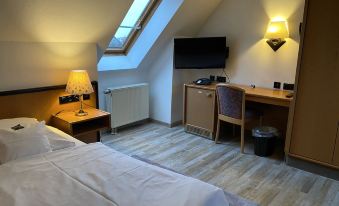 Keurig hotel met minibar en je kon koffie op je kamer zetten. Was gestrand door teveel verkeer, moest stante pede een overnachting zoeken. Telefoonnummer op de deur van het hotel gebeld, eigenaar kwam zonder problemen. Ontbijtbuffetje met van alles en nog wat. Jammer dat er geen lift is en vervelende hoge opstap van de douche. Kon er niet eten 's avonds, eigenaar zegt je waar restaurantjes zijn in de buurt.