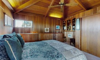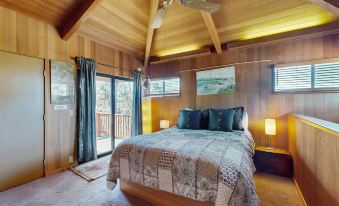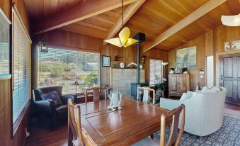 A walkable, in-town location meets a tranquil country setting at this inviting home in Gualala, a beautiful escape with blue-water views of the Pacific Ocean. In this secluded coastal town on the rugged Northern California Coast, you'll enjoy a quiet piece of property that's surrounded by wind-blown cypress and lush vegetation, backing up to a seasonal creek. The interior makes gorgeous use of natural wood, including beamed ceilings, richly hued walls, and a staircase that was hand-crafted in the Craftsman style. When the sun is shining on the coast, you can walk to the bluff at Robinson Gulch, light the gas grill for an afternoon barbecue, or simply relax in the fresh air in the yard or on one of the two decks with seasonal views of the creek. And when the fog rolls in, you can retreat indoors to toss the provided beach towels in the washer/dryer, warm up by the gas fireplace, and watch a DVD or stream a favorite on the Smart TV. When it's time to turn in, you'll find one bedroom with a queen-size bed on the main level and another, loft-style room with a queen-size bed upstairs; both bedrooms have access to an outdoor deck.