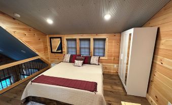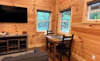 Once you enter into the shared driveway you will pass through stone pillars and gates that will take you right The Pine Ridge Cabin House. Please park on the side of the cabin (2 car maximum). Once you enter through the keypad door you will enter into a cozy space that has everything you need for a quiet and peaceful getaway. There are shades for most windows and doors for your privacy. There are two triangle shaped windows at the top peak of the living room wall that allows for natural light to come into the indoor space. These two windows do not have blinds and there will be natural light from the adjacent wooded area that comes through during daylight hours. The upstairs loft is the main bedroom equipped with a King size bed, wardrobe and desk area. There is no private door to the loft area. There is a second full-size sofa bed in the main living room. Sheets, pillows and blankets are located in the upstairs wardrobe. Before using the sofa bed, roll the cart below the t.v. to the right (behind the table and chairs). You will then be able to pull the sofa bed out without moving the couch. The bathroom is equipped with a small stand up shower, toilet and sink. Towels, washcloths, and hair dryer are supplied. Limited supply of shampoo, conditioner, body wash, toilet paper and paper towels are also provided upon arrival. The kitchen has a full size refrigerator with freezer, microwave and oven/stove. It is well equipped with everything you need to make breakfast/lunch/dinner. There is also a gas grill located on the covered back patio area. Please move the grill away from the cabin siding when operating and there are grilling utensils in the drawer next to the refrigerator. An outdoor dining table and various outdoor seating areas are available for your enjoyment. Be sure to take advantage of the fire pit as fire wood is provided free of charge. This beautiful piece of property is nestled back against the woods and does come with the possibility of various outdoor insects and wildlife viewing. About pets:No pets allowed.About checkOut:Check out before 11:00 AM.About children:Children allowed: ages 3-17.About checkIn:Check in after 3:00 PM.About smoking:Smoking allowed: in designated areas.About minBookingAge:Minimum age to rent: 25.About events:No events allowed.