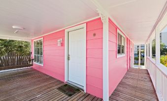 Colorful cottage in Gulf Shores with freshly updated interior and exterior. Nestled between Little Lagoon and the beach. 10th Street Public Beach access point with crosswalk, boardwalk, and shower is an easy walk - a little over a block away (0.3 mile. Property comfortably accommodates 4 guests - 2 bedrooms and 1 full bathroom. There is a spacious, open living area, kitchen, and dining table. Kitchen equipped with appliances and basic cookware. The covered porch is ideal for relaxing on the porch swing and getting a glimpse of the lagoon across the street. West Lagoon Ave provides easy access to several restaurants and a paved multiuse pedestrian path. Popular tourist spots, restaurants, shopping, mini golf, etc. are only minutes away.