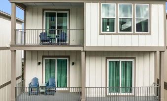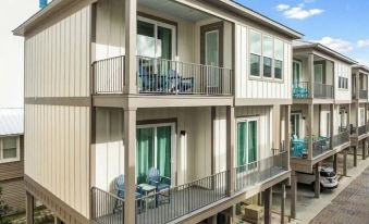 The main floor is on the second story with an over-sized central island, spacious living room and dining room, bunk bed sleeping for two (big enough for adults), and a full bathroom. There is a large smart TV in the living room with cable, but feel free to log into your streaming service (Netflix, Hulu, Disney+). There is also a TV in each bedroom. Two large sets of sliding doors fill the living and dining room with light and views of the Little Lagoon and community pool. A balcony spans the whole front of the cottage and allows amazing views of the bay. Upstairs there are 2 bedrooms with access to a balcony and their own bathrooms. One bedroom has a queen bed and twin bed in it. The primary suite has a King bed. The laundry room with a full size washer and dryer is on this floor as well in the hallway. There is an outdoor storage closet which has 4 beach chairs, and umbrella and some beach toys.
