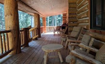 This beautiful ranch style log cabin has an open floor plan. Each room has large windows for viewing the forest and wildlife. Oak flooring is throughout the cabin. The very large covered front and back porches are great places to watch wildlife or sit back and relax. There is a propane outdoor grill, tables and lots of seating including rocking chairs and a swing. On the east side of the cabin is a sun deck with lounge chairs for your enjoyment, and at the backdoor is another large, covered porch with table and chairs for your relaxation. A large firepit with split firewood is for campfires and nighttime relaxing.