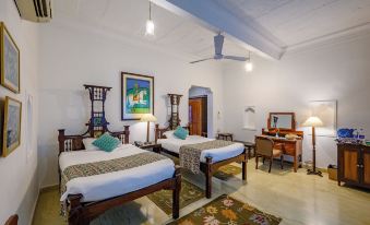 Hotel che appartiene ad una catena di alberghi in tutta l India. La residenza appartiene ad una famiglia nobile. È affascinante, ben tenuta , attenzione particolare bel restauro. Giardini verdi ricchi di fiori, piante tipiche curative, pavoni, uccelli variopinti. Personale gentile, attento nell esaudire ogni richiesta degli ospiti con ottimo inglese . Ci hanno fatto fare un tour storico della proprietà. Ne vale la pena. Prezzo coerente con la location.