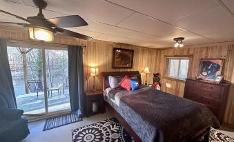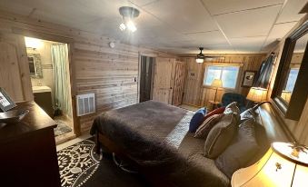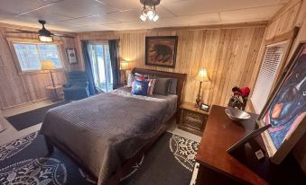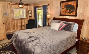 This is a clean, rustic 2 story cabin with a spiral staircase separating the two levels. Ideal for a couple or a small family looking for a private getaway. The master bedroom is downstairs and has a queen size bed and a private bath. The second bedroom is downstairs in an open common area, outside the master bedroom with a set of bunk beds and a full size Murphy Bed that pulls out of the wall. Recommended for a maximum of 4 people.