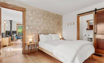 On the first floor, a serene queen bedroom with en suite bath features vintage wallpaper uncovered during the home’s renovation—a beautiful nod to the home’s history.
