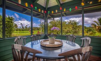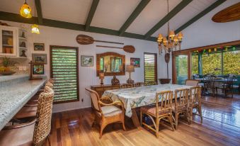 Hanalei Happy Place Main House features a fully-equipped kitchen with plenty of space and utensils for food preparation, WiFi and laundry amenities. The kitchen also features a bar top seating area, in addition to two separate dining areas – one formal and one on a breezy screened lanai.