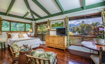 Hanalei Happy Place Bungalow has a queen-size bed, topped with light, airy linens. Guests have views of the surrounding tropical garden. The Bungalow has air-conditioning, WiFi, cable tv and laundry amenities for convenience.