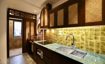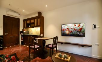 a hidden underestimated gem in West Lake, Hanoi. the room is beautifully designed with timeless wooden interior, elegant emerald ceramic bowls and plates. the room comes with a full functional kitchen, refrigerator and utensils. the big TV has internet - Netflix, YouTube, cable channels.