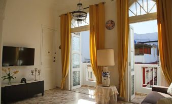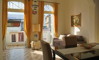 El saloto molto confortevole con TV e divano . Balconi che si affacciano verso l'esterno dove si può godere del viavai delle persone e del commercio. La sala da pranzo è dotata di tavolo allungabile e troverete tutto per trascorrere una cena romantica.