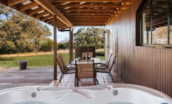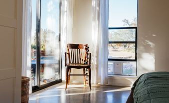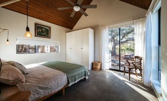 The main house accommodates 10 guests in 5 bedrooms. The H-shaped floor plan enables the bedroom wing to tuck into a grove of junipers. The master bedroom is fitted with a king-size bed and an en suite full bathroom. It boasts floor to ceiling windows that immerse you into the countryside.