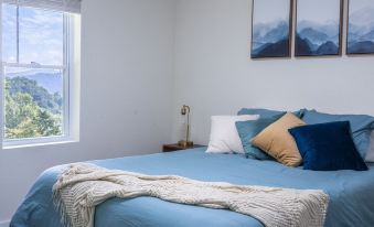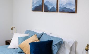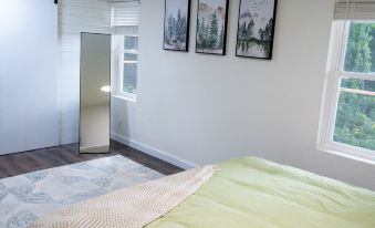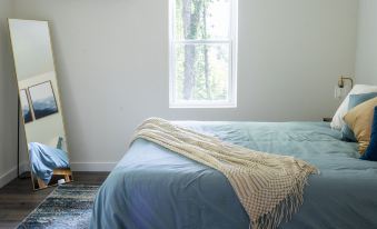 On the other side of the cabin you will find our “Forest Room”, with green accents, that is sure to bring a tranquil environment to your stay. Fitted with a memory foam king bed, a dedicated mini-split AC unit, a massive closet, as well as a small desk for those that plan on spending any time working. This room also has a very roomy and comfortable folding queen bed and mattress that we keep stowed in the closet until it's needed for use. It fits comfortably in the room when in use (refer to pictures for reference). This room also has its own fully renovated full bathroom right across the hallway.