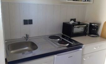 Camping in Sperrmüllambiente.Die Vermieterin freundlich, das Apartment sauber aber zu klein für 2 Personen, die Koffer mussten im Auto bleiben. Die kleine Gartenterrasse könnte mit wenig Aufwand nett gestaltet werden. Man sitzt an einem Sperrmülltischchen umgeben von ähnlich deprimierenden Gegenständen.