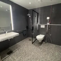 Very new and modern! The hotel offers automated check-in, check-out, and luggage storage. On the ground floor, there’s a well-equipped kitchen, a laundry room, a small library, and a play area for children. Staff are also available in the office if you need assistance. Highly recommended!