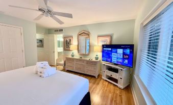 Our VILLA features two en-suite king suites, both with fully remodeled baths upstairs. . both bedrooms have ceiling fans, flat screen HDTV, BLUE RAY DVD, NETFLIX. we have premium linens and premium amenities. one master suite has a king size bed, a very large closet and a 55 inch flat screen HDTV with over 200 channels. Free Netflix, Amazon Video