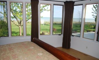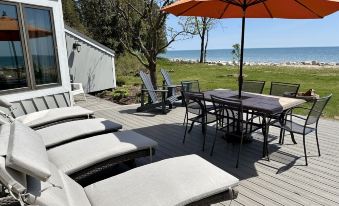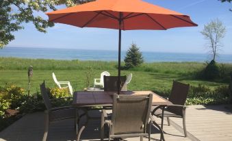 Located at the very end of a beautiful private road, the Sand Castle Beach House is nestled between beautiful Lake Michigan shoreline and a gorgeous forest. The 3 acre private and exclusive lot features an expansive lake side yard that is level and ready for outdoor games. 2 grills on the large lakeside deck are ready for your vacation time. Laze in the chaise loungers or Adirondack chairs and listen to the waves lap the shoreline.