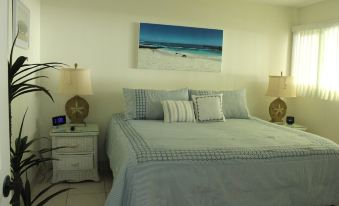 Ocean front doesn't get any closer! Enjoy the beach and the views' in this fully remodeled gem. Open the windows and let the ocean sounds take over! Brand new kitchen, custom made furniture, AC in all rooms, and beach access makes this vacation rental the perfect getaway! Very quiet neighborhood, and a 5 minute trolly or car ride to restaurants, bars and shopping. 400 meg High speed WiFi, desk phone, and extra monitor is the perfect setup for remote workers. Supplies include boogie boards, snorkel gear, beach chairs, umbrella, and wagon. No need to rent a vehicle, new Honda HRV available for your use! (requires copy of DL and auto insurance). Grill, swim, layout, or relax in our ocean front private pool area. Master bedroom includes a king bed with pillow top comfort, nightstand dressers, AC, ceiling fan, recessed lighting, and a remote speaker for easy TV listening. 2nd bedroom includes 2 twin beds that combine to make a king. AC, Nightstands, ceiling fan, dresser, and smartTV.