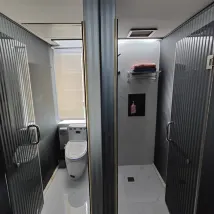 Sarebbe meglio se la TV fosse messa al centro Spero anche che lo shampoo e il bagnoschiuma siano separati.