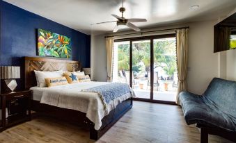 2. Second floor (total of 3 rooms; you can rent all 3, 2 with an adjoining kitchen or just one private suite)- 2 bedroom suite that opens to a kitchen/dining/living room and a one bedroom apartment that can be rented separately or with the other 2 rooms for larger groups. All rooms have king-size beds and spectacular Caribbean views.