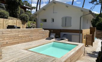 * family with children (not recommended between 6 months and 3 years old because raised terrace, fall possible for daredevils :)). Access to Ocean Beaches and Lake Beach on foot (about 600m). Closed ground sported by 1 100m² which gives on the pines, a calm and restful place.