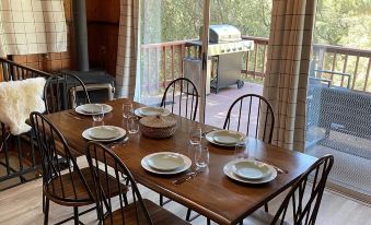 Idy Hideaway is a beautiful forest green retreat that seamlessly blends into its natural surroundings. Tucked away amidst the pine trees, this charming 3-level cabin can comfortably accommodate up to 8 guests. The main floor offers an open layout, showcasing a living and dining area complete with a grand fireplace and a wood-burning stove. Skylights set into the vaulted ceilings and a large sliding glass door allow plenty of natural light to filter in, providing forest views from every angle.