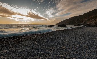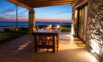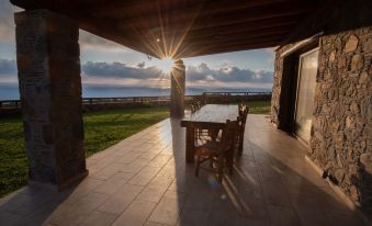 Open terrace and veranda with a magnificent view on an ample stretch of the Cretan Sea, with its breathtaking sunsets and, in the night, a million stars appearing just when the jasmine starts to spread its sweet fragrance. A friendly and cozy fireplace for the colder season.