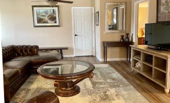 Furnishings include turn-key kitchen, coffee pot, microwave, full size fridge, single leather recliner and leather love-seat dual recliner, office nook with desk in main area, desk and chair in bedroom, all bedroom and bath linens, 2 closets, TV in living area and bedroom, DVD player, Cable, Stereo, Alarm Clock.