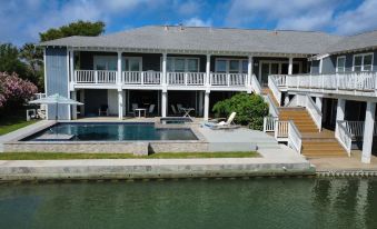 Lovely southern style waterfront home located in a cove/lagoon in Jamaica Beach, Galveston that is a few houses from the bay with an excellent view. Large 3,394 sq ft home with one master suite, and three additional master bedrooms. There are 6 bathrooms total on the main floor. An elevator and a handicap accessible bathroom have been installed to make everyone comfortable and welcome. There is an expansive covered porch and decking on the main floor with rocking chairs, a swing, and additional seating on the uncovered portion. The master suite has sliding doors that open to the porch and face the water. The sleeping situation is as follows: