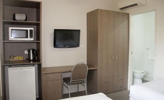 Great to find a cupboard in our studio room, would be even better if there was a coat hanger in there! Very basic but clean except for the carpet full of stains. Reception staff very friendly and helpful.
