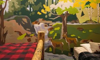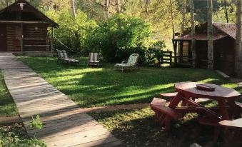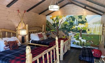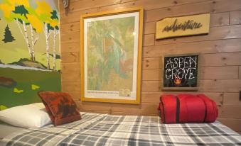 There are four custom Moonlight Cottages at The Aspen Grove Inn at Heise Bridge. This 1-bedroom cottage in Rigby called “Howdy” has a Western theme with a barky log finish feature wall, and “Howdy” is perfect for your escape. The cozy space features 2 queen beds and 2 kid-friendly twins bunked, plus a mini kitchenette including a bar table and three stools. With heating and AC you'll be comfortable no matter the season. Our high mountain plain nights are quite cool, so bring your jackets for star-gazing and owls hooting.
