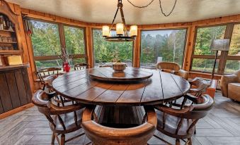 This is the perfect getaway for families, friends, and couples. Its large living room and fireplace, makes it the perfect cozy retreat. Want to play some games, go to the den and sit around the large hand crafted table, while enjoying spectacular mountain views.
