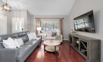 Step inside to discover a meticulously appointed space, boasting two living areas, a large dining space, and a fully-equipped kitchen. The kitchen is a culinary delight, featuring amenities such as a Keurig, coffee maker, Kitchenaid Stand Mixer, blender, crockpot, and more. The family room is bathed in natural light, offering cozy seating and a fireplace, while a secondary living room provides additional space for larger groups or kids to enjoy. Upstairs, four spacious bedrooms await, including a primary bedroom with a king-sized bed, Smart TV, and ensuite bathroom with a stand-up shower and jetted tub. The remaining bedrooms feature two queen-sized beds and a king-sized bed, sharing a well-appointed bathroom with dual sinks and a stand-up shower.