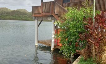 Our property sits on the hillside above the water. Access to the boathouse and or dock is via a staircase leading down from the pool level which you can see in the photos. The private, nautical-themed, one-1 Bedroom boat house sits right above the water and is the perfect choice for couples seeking quiet privacy, getting in touch with nature, immediate water access, and picturesque views for a romantic getaway or as an oasis for water sports..