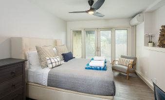 Haiku fans and AC keep you cool when the island breeze isn't blowing; room-darkening curtains and white noise machines in every bedroom make it easy to snooze after the day's adventures. Upstairs, away from the hustle and bustle of the living room/kitchen is a Tempur-Pedic king-sized bed in one room; two sets of bunk beds (the kid's room) with full-sized mattresses on the bottom in the other room; and a full bathroom. The downstairs bedroom has another Tempur-Pedic split king bed with a power base for getting comfy while reading or watching a movie. A queen-sized bed and a custom-made monkeypod desk are in the den for those who need to check in on the office or just escape to surf the web.