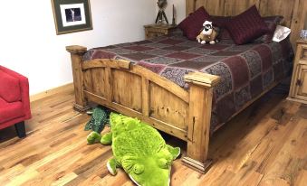 ~Upstairs 'Peter Pan' room with queen sized bed plus double sized futon sofa sleeper (no closet; portable clothes rack and dresser provided). No view. Room includes hair dryer and mirrors.