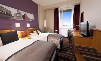 The Leonardo Hotel in Karlsruhe offers good value for the price. We were a bit disappointed upon arrival to find that despite booking a double bed, we were given two single beds instead. We were told by staff that a double bed was only a "wish" and not a guarantee. We couldn't easily push the beds together because of the fixed console in the middle.