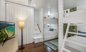 The fourth bedroom is children’s favorite! The high quality custom built bunks beds are twin size, they feature guardrails and staircases for easy access with storage space.
