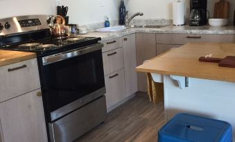 Modern stainless kitchen. New dining table, wine fridge, dishes and comfortable eating, games, and hang out space. Smart tv in the living area with couch, chairs ottoman and comfort for apres ski or for after sledding, touring swimming, etc.