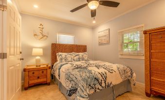Two of the Queen bedrooms share an en-suite bath easily assessable from either bedroom. It features a very large walk-in shower. The 3rd bedroom features a full sized bed, walk in shower and private entrance. The quaint living room has a new L Shaped Sofa that provides plenty of additional sitting room for kicking back and chill time.