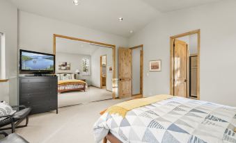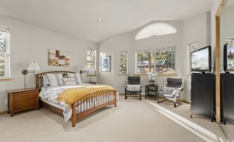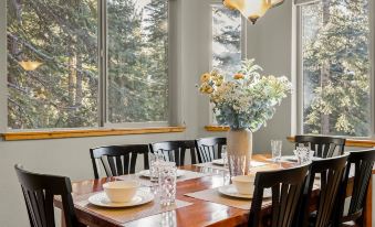 The North Lake Tahoe Vacation Lodge has a beautiful open-plan main floor living area with a comfortable living room, large kitchen and spacious dining area that serves as the perfect gathering place for family and friends. With cream-colored walls, large windows, and vaulted wood ceilings with recessed lighting the space is beautifully designed and creates a bright and airy atmosphere.